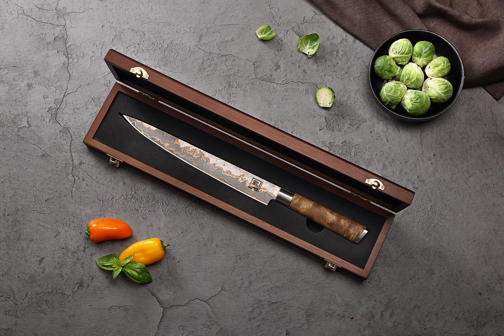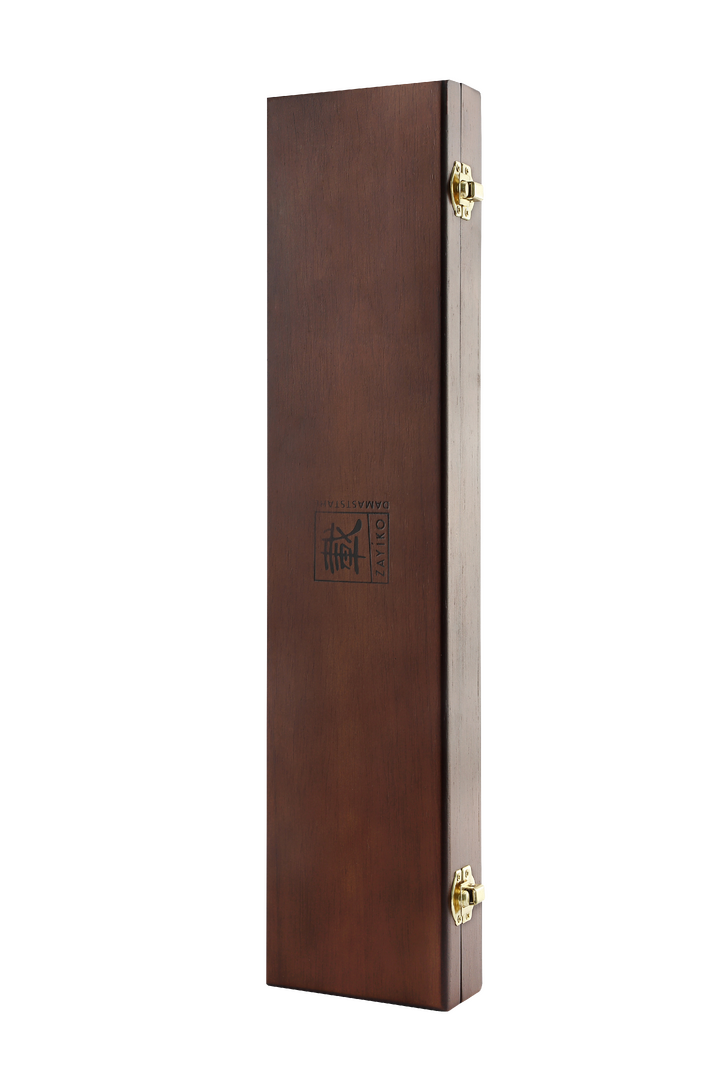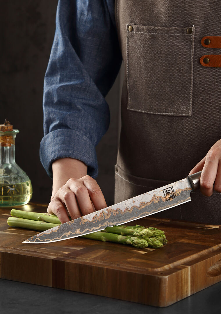 Das Zayiko MysticMagma Sashimimesser: Seine 25 cm lange Klinge aus 67 Lagen VG10Damaststahl mit Kupfer. und Bronze-Einlagen ermöglicht hauchdünne, saubere Schnitte – ideal für Sashimi, Sushi oder feinste Fischfilets.