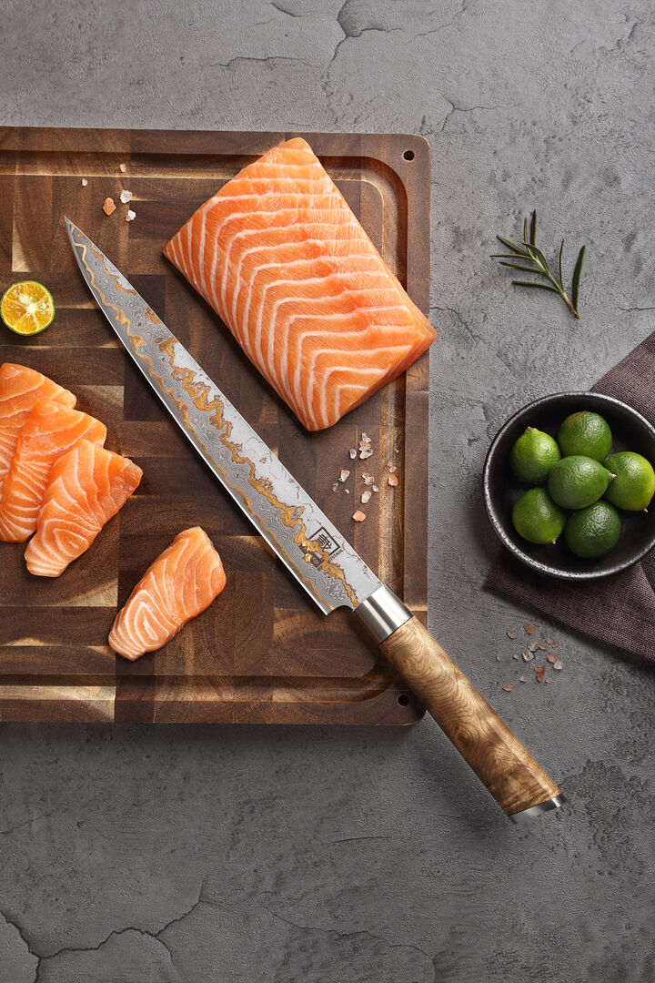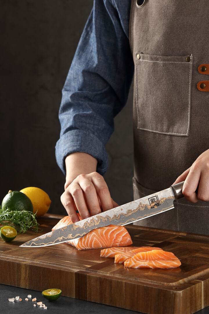 Das Zayiko MysticMagma Sashimimesser: Seine 25 cm lange Klinge aus 67 Lagen VG10Damaststahl mit Kupfer. und Bronze-Einlagen ermöglicht hauchdünne, saubere Schnitte – ideal für Sashimi, Sushi oder feinste Fischfilets.